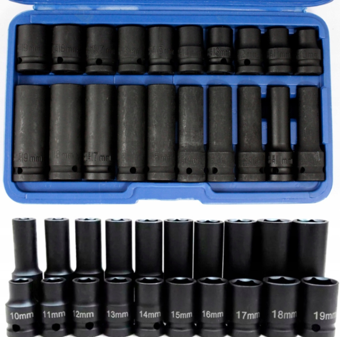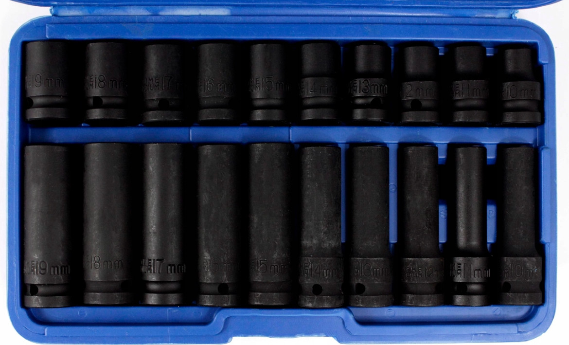 - Включає в себе шестигранні ударні головки популярних розмірів від 10 до 19 мм.