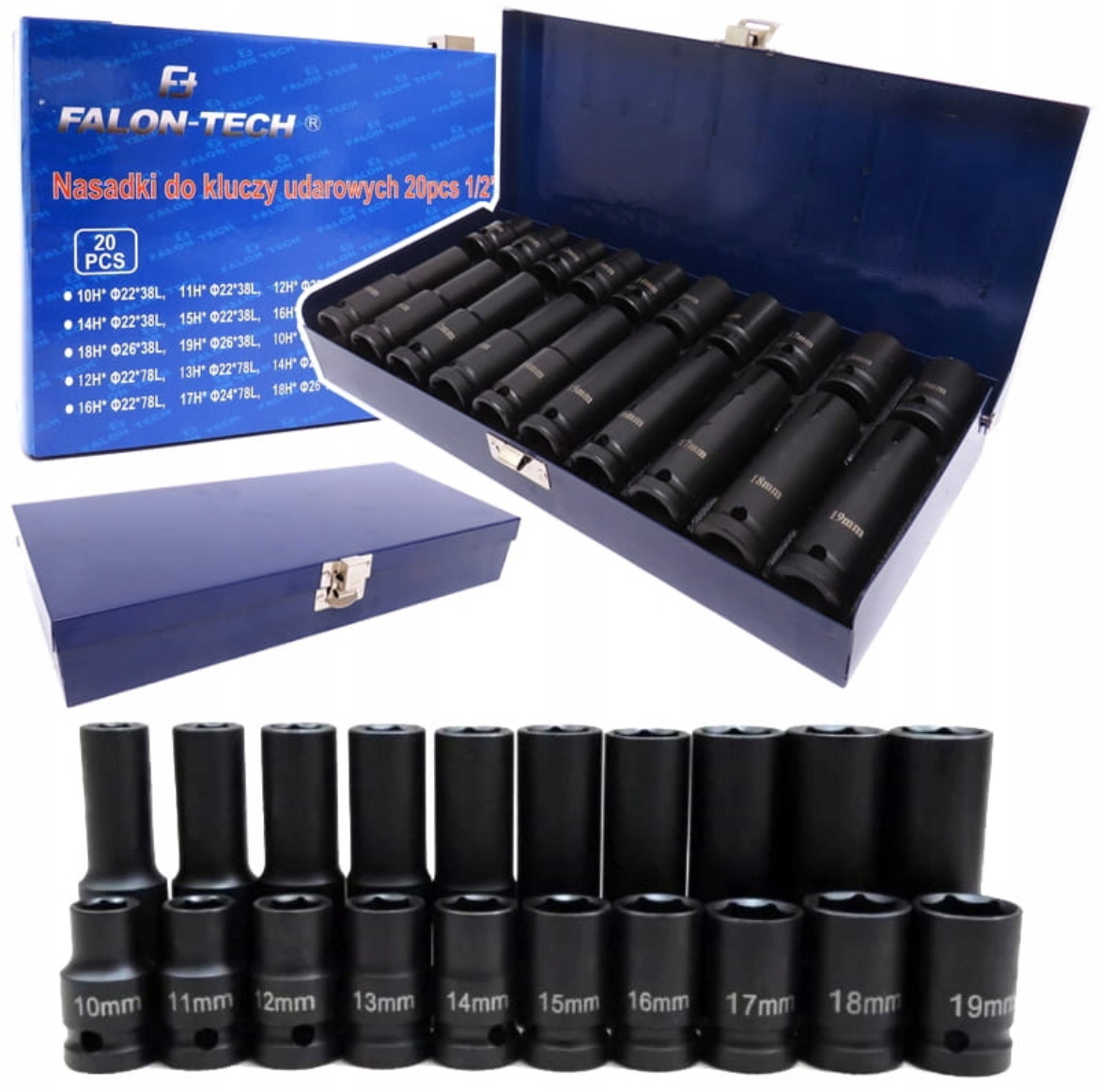 - Набір шестигранних ударних головок 1/2" від відомого бренду FALON TECH, довгих (78 мм) та коротких (38 мм), що складається з 20 елементів.